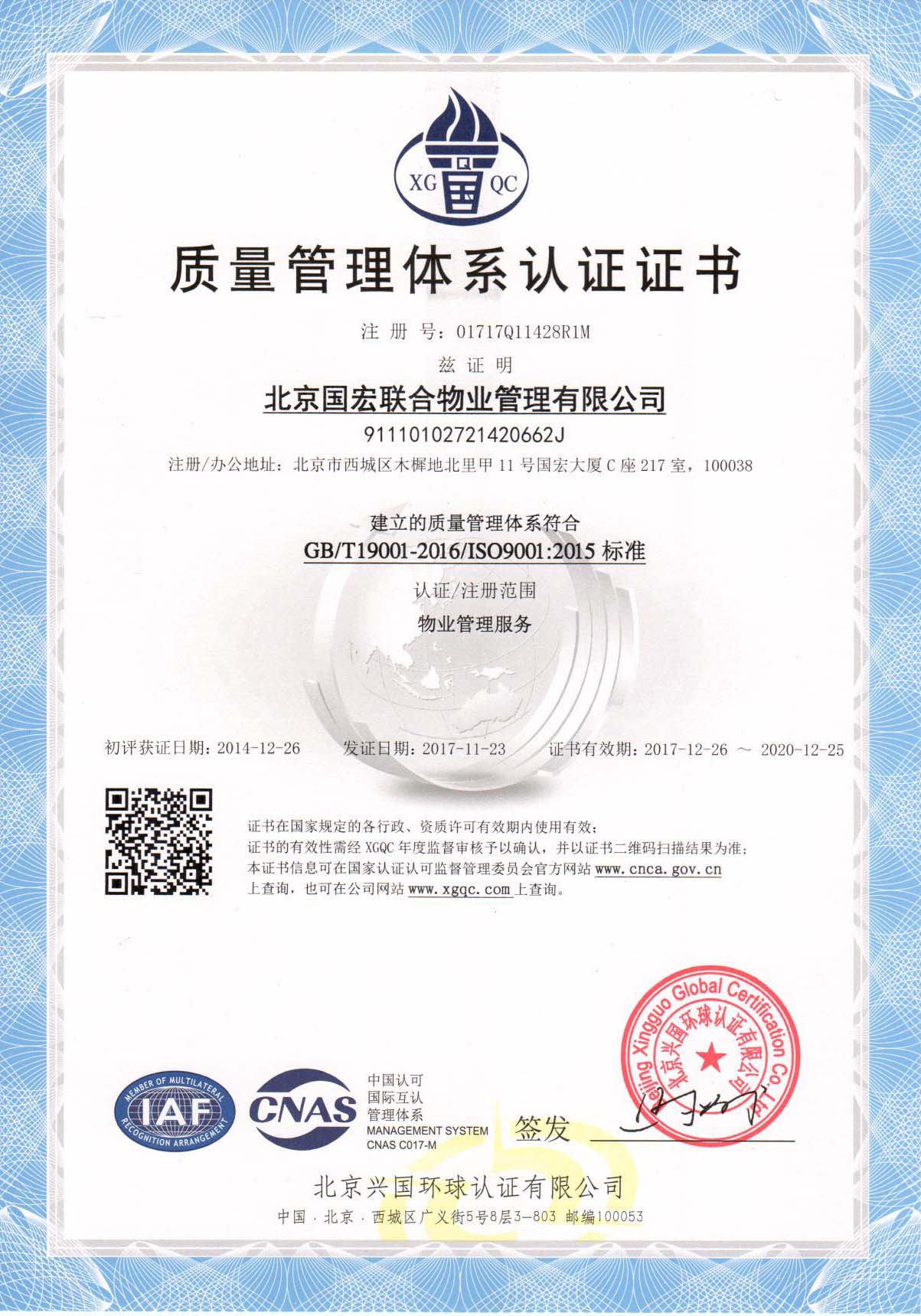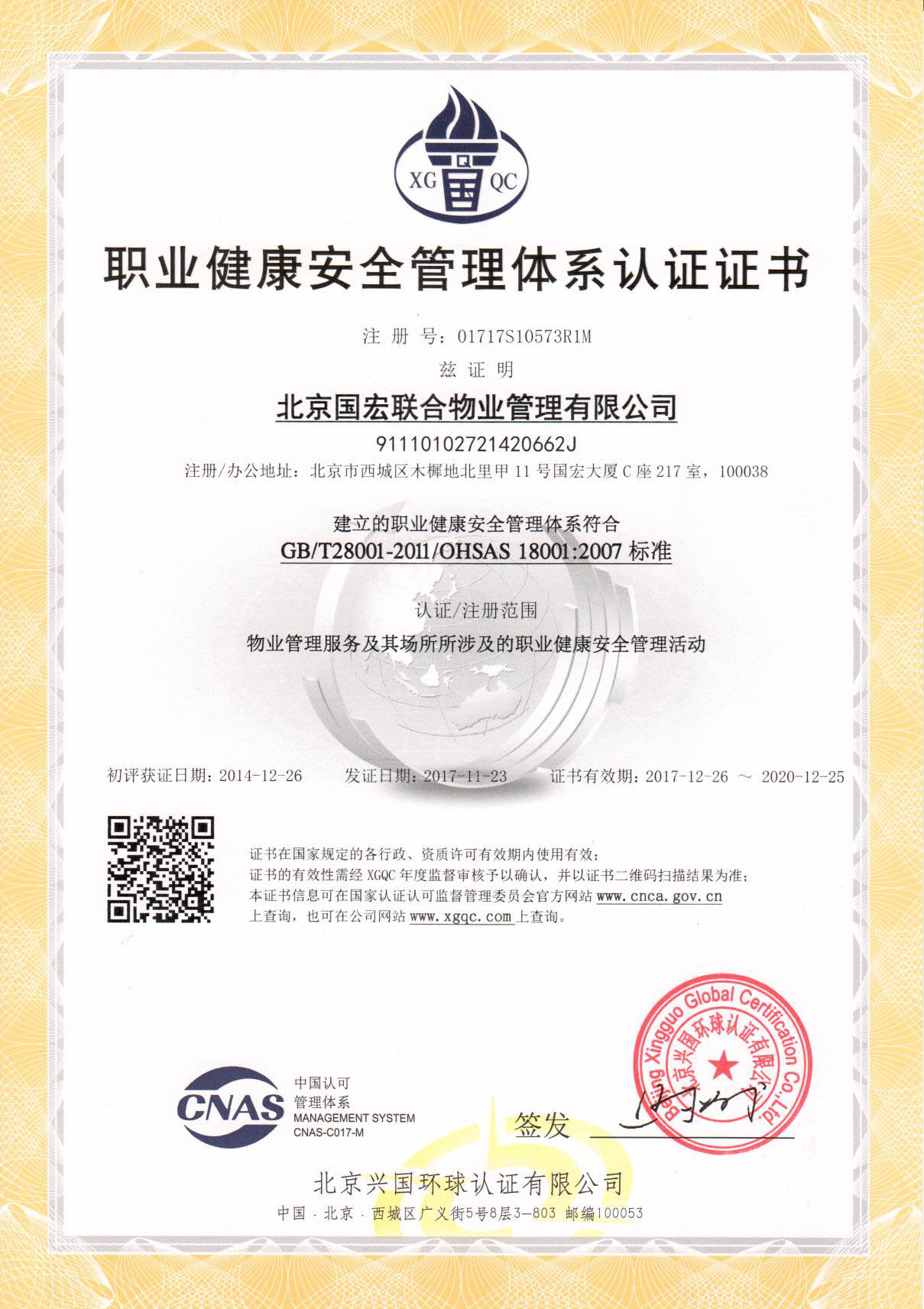 北京国宏联合物业管理有限公司(以下简称:国宏物业)是国家发改委宏观经济研究院下属公司,现为中国物业管理协会常务理事单位,是具有国家物业管理二级资质的专业物业公司,公司为首批通过国际权威机构ISO9001:2000版国际质量管理体系认证,并获得国际认证联盟在全球34个国家和地区承认的10Net管理体系认证证书企业,开创了物业管理行业双重认证的先河。